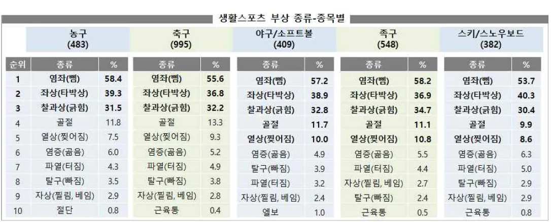 그리고 이 5개 종목의 부상 종류는 염좌가 가장 많았고, 타박상과 찰과상이 뒤를 이었습니다. 병원에서 쉽게 치료할 수 있는 부상들이 대부분이지만, 다치는 것 자체가 운동을 하기에 리스크가 크죠.