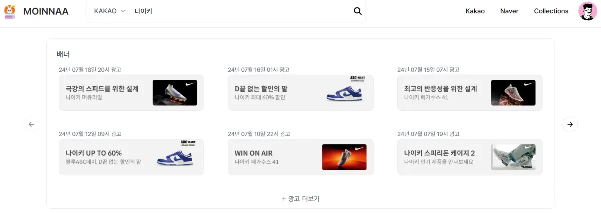 MOINNAA는 출시한 지는 얼마 되지 않은 사이트입니다. 하지만 카카오와 네이버에서 집행하고 있는 광고 현황을 확인할 수 있다는 점에서 유용한 사이트라고 할 수 있습니다.