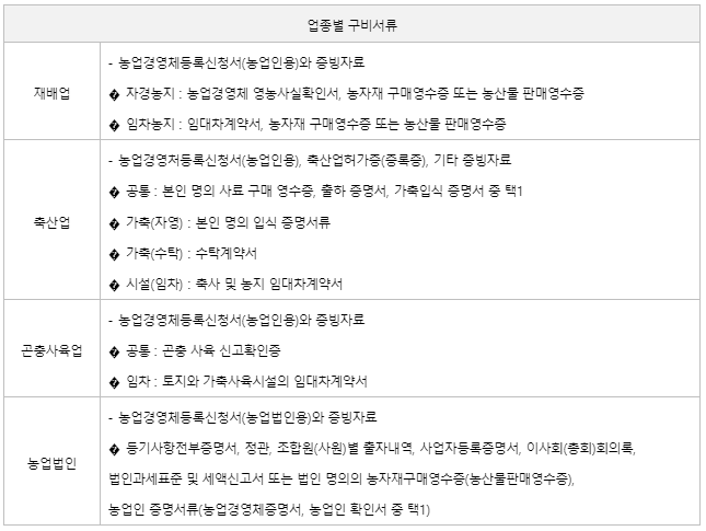 - 축산업 – 축산업허가증 혹은 등록증, 사료 구매 영수증, 출하증명서, 가축임식증명서 중 한 가지, 본인명의 입식 증명서류(가축수탁 – 수탁계약서, 시설임차-임대차현황포함된 농지대장)