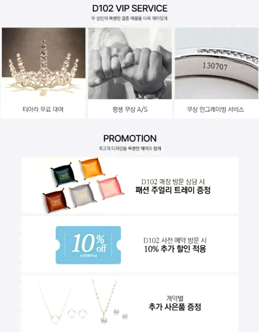 결혼반지를 맞추려고 🔍대구 D102를 방문했는데요! 웨딩 박람회에서 웨딩 플래너님을 통해서 예약했던 터라 예물 반지 할인을 조금 더 받을 수 있었고, 10만 원 상당의 웨딩 밴드 가드링도 무료로 제공해 주셨습니다.