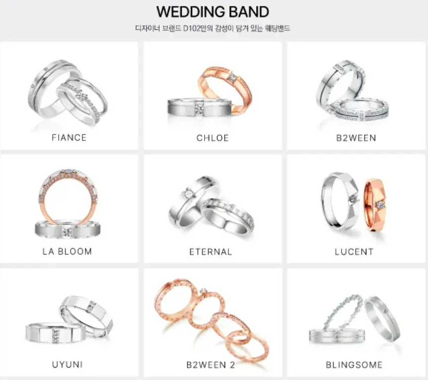 D102의 D는 대구의 D가 아니고요. 다이아몬드를 뜻하는 D입니다. 다이아몬드 전문 예물 브랜드를 뜻하는 말로 모든 웨딩 밴드에 다이아가 들어가는 듯했습니다.