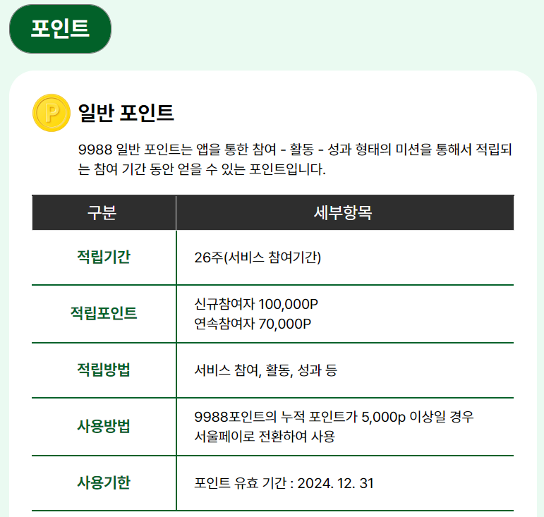 손목닥터9988의 포인트는 일반 포인트라고도 하는데요! 일반 포인트는 앱을 통한 참여 – 활동 – 성과 형태의 미션을 통해서 적립되는 참여 기간 얻을 수 있는 포인트라고 해요.