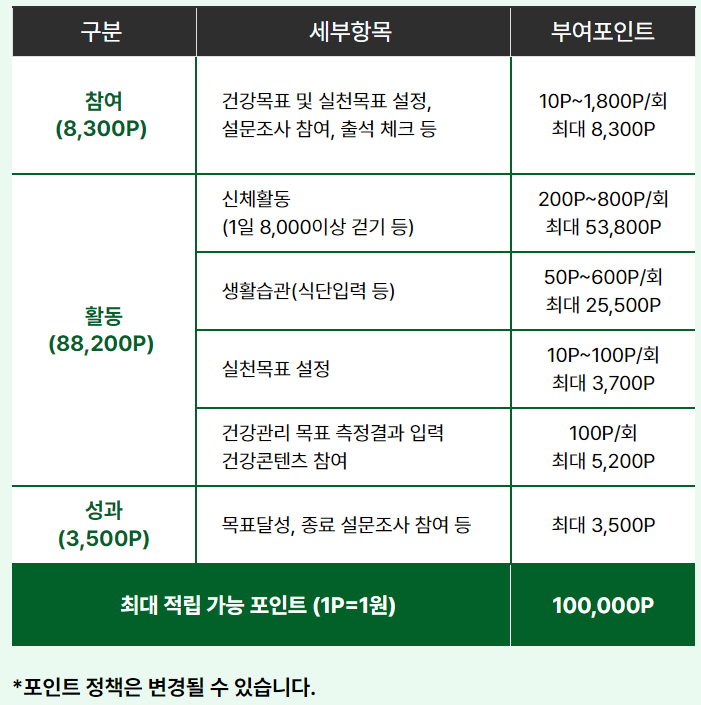 구체적으로는 참여시 최대 8,300포인트, 활동 시 88,200포인트, 성과 달성 시 3,500 포인트를 지급하고 있습니다.