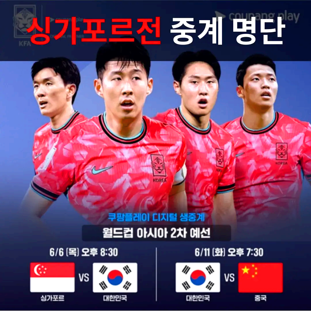 북중미 월드컵 아시아 예선 한국 대 싱가포르 경기가 6월 6일 오후 9시에 열립니다. 이 경기는 김도훈 임시 감독 체제로 치르는 첫 경기이며, 안정적인 진출을 위해 반드시 승리해야 하는 경기입니다.