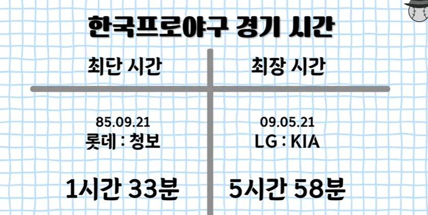 한국프로야구의 경우에도 경기 시간이 🔍최단 1시간 33분부터(85.09.21 롯데 : 청보) 최장 5시간 58분까지(09.05.21 LG : KIA) 그 시간이 천차만별입니다.