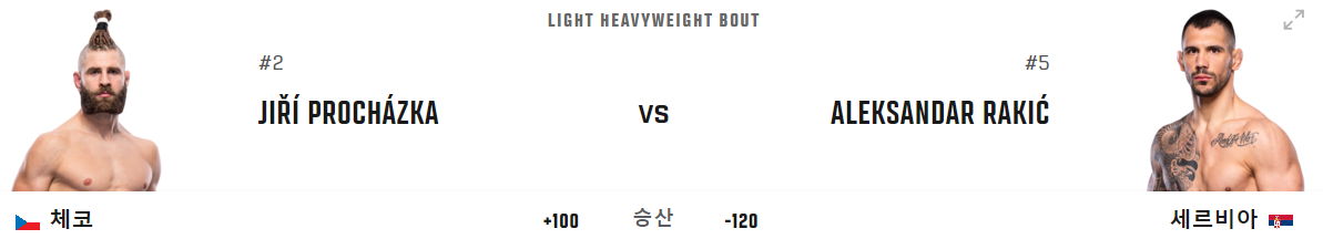 마지막 UFC 300의 언더카드 경기는 라이트 헤비급 랭킹 2위인 이리 프로하츠카와 5위 알렉산더 라키치의 경기입니다. 아쉽게 랭킹 2위로 내려간 프로하츠카이지만, 실력적으로 우수한 모습을 보입니다. 하지만, 라키치 역시 타격과 그래플링 모두 훌륭한 선수이기에 도박사들은 라키치의 승리를 보고 있네요.