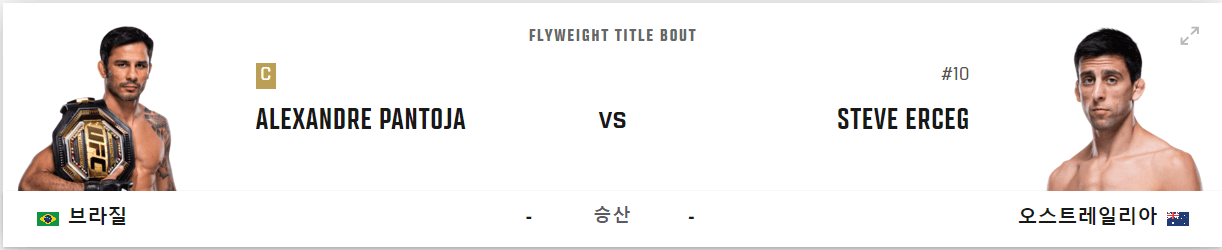 두 번째 메인이벤트는 알렉산드르 판토자와 스티브 얼섹 선수의 경기입니다. 판토자는 플라이급 챔피언이고, 얼섹은 랭킹 10위에 올라 있습니다.